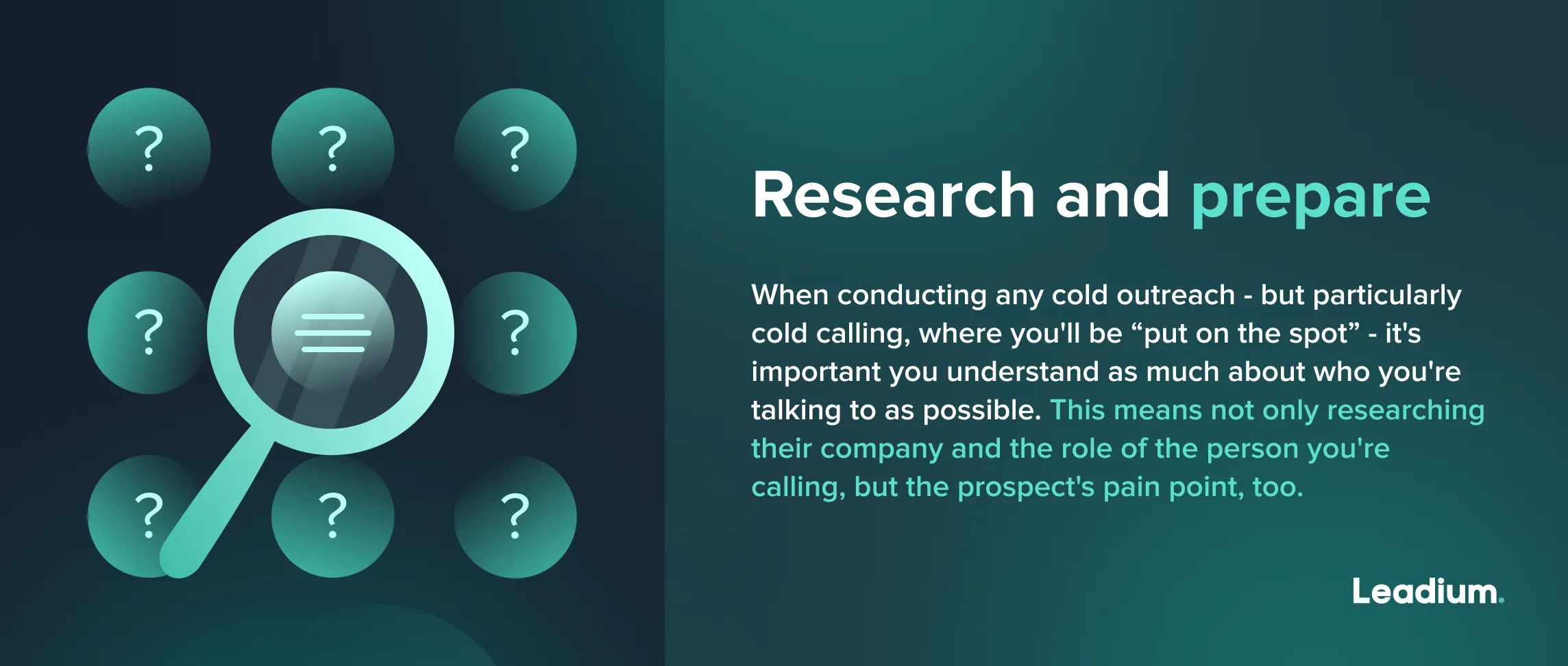 When conducting any cold outreach - but particularly cold calling, where you'll be 'put on the spot' - it's important you understand as much about who you're talking to as possible. This means not only researching their company and the role of the person you're calling, but the prospect's pain point, too.