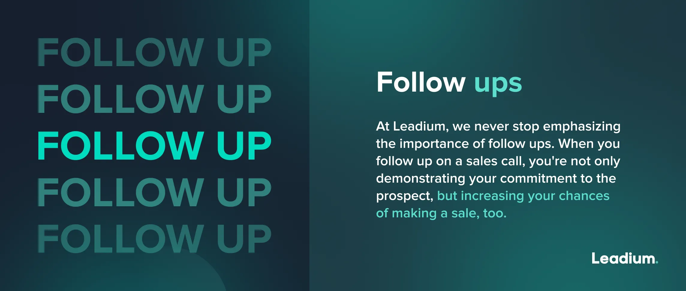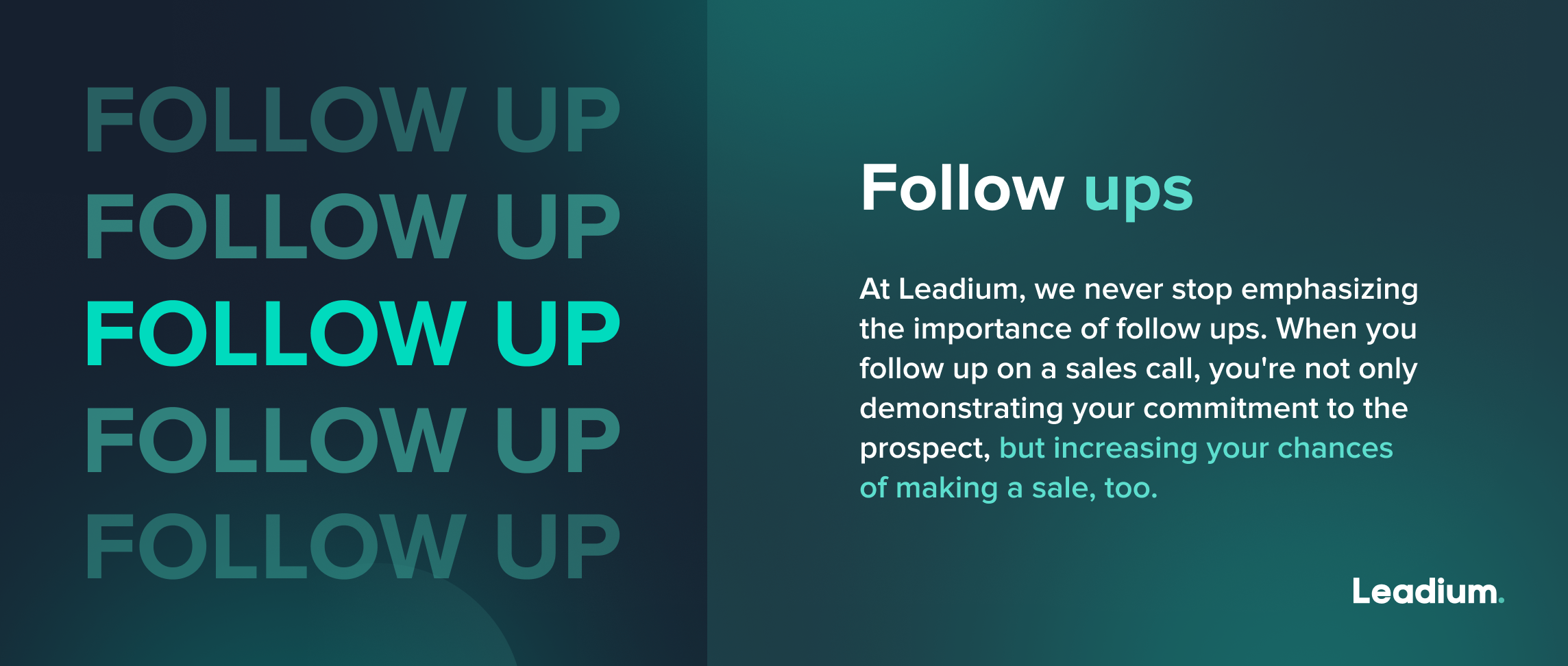 At Leadium, we never stop emphasizing the importance of follow ups. When you follow up on a sales call, you're not only demonstrating your commitment to the prospect, but increasing your chances of making a sale, too.