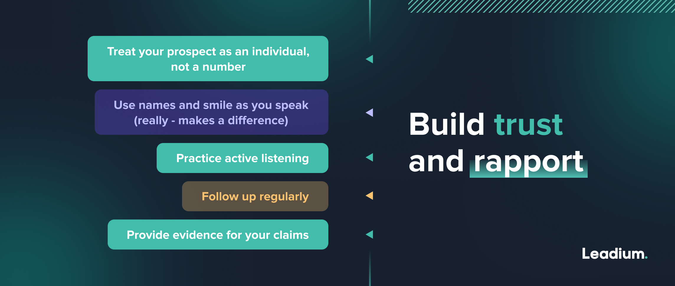 These stats demonstrate just how important it is for prospects to trust the seller. The problem for the seller is that they need to prove their credibility. Here are some tips you can use to start building better rapport today: