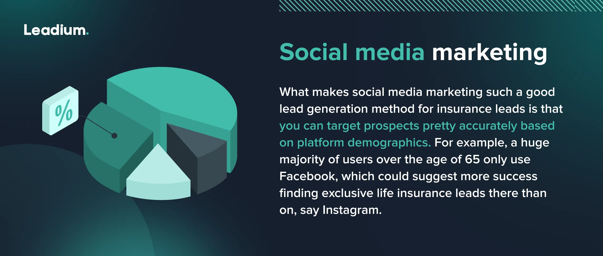 What makes social media marketing such a good lead generation method for insurance leads is that you can target prospects pretty accurately based on platform demographics. For example, a huge majority of users over the age of 65 only use Facebook, which could suggest more success finding exclusive life insurance leads there than on, say Instagram.