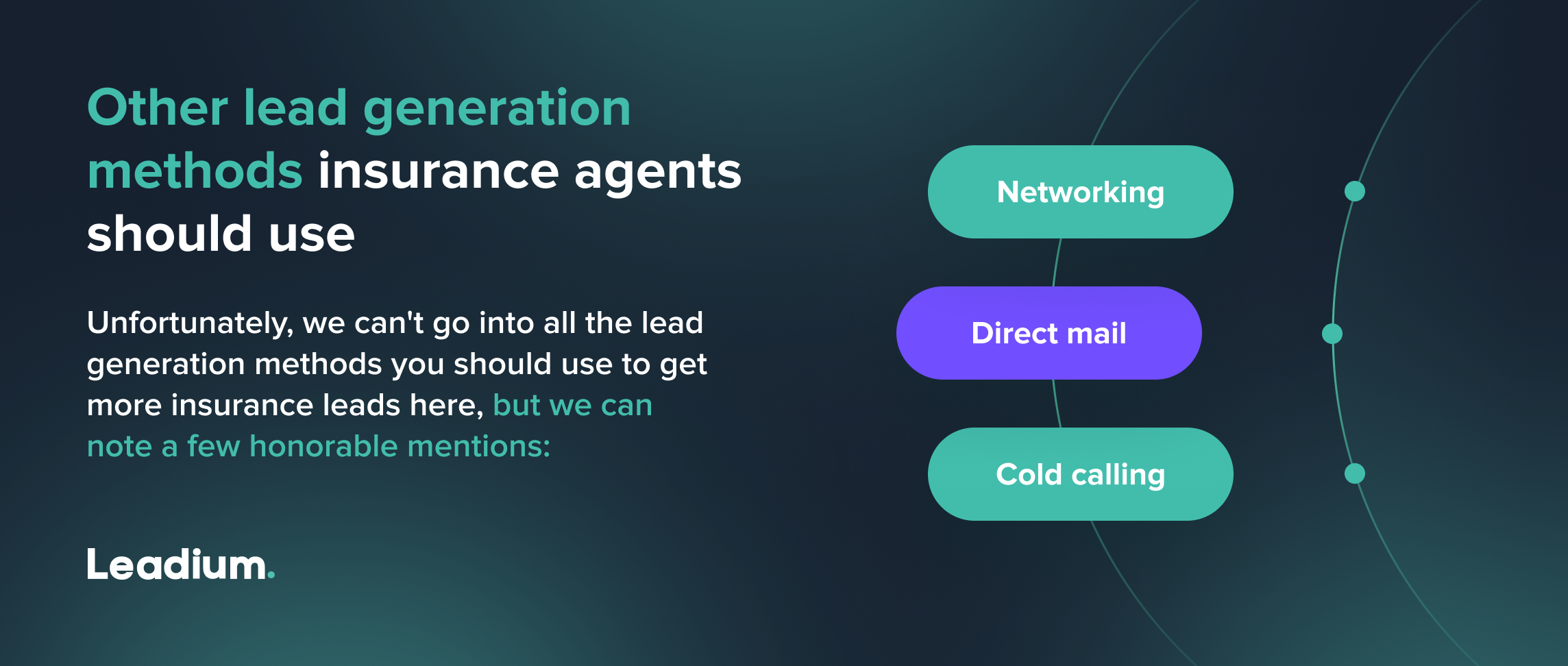 Unfortunately, we can't go into all the lead generation methods you should use to get more insurance leads here, but we can note a few honorable mentions:
