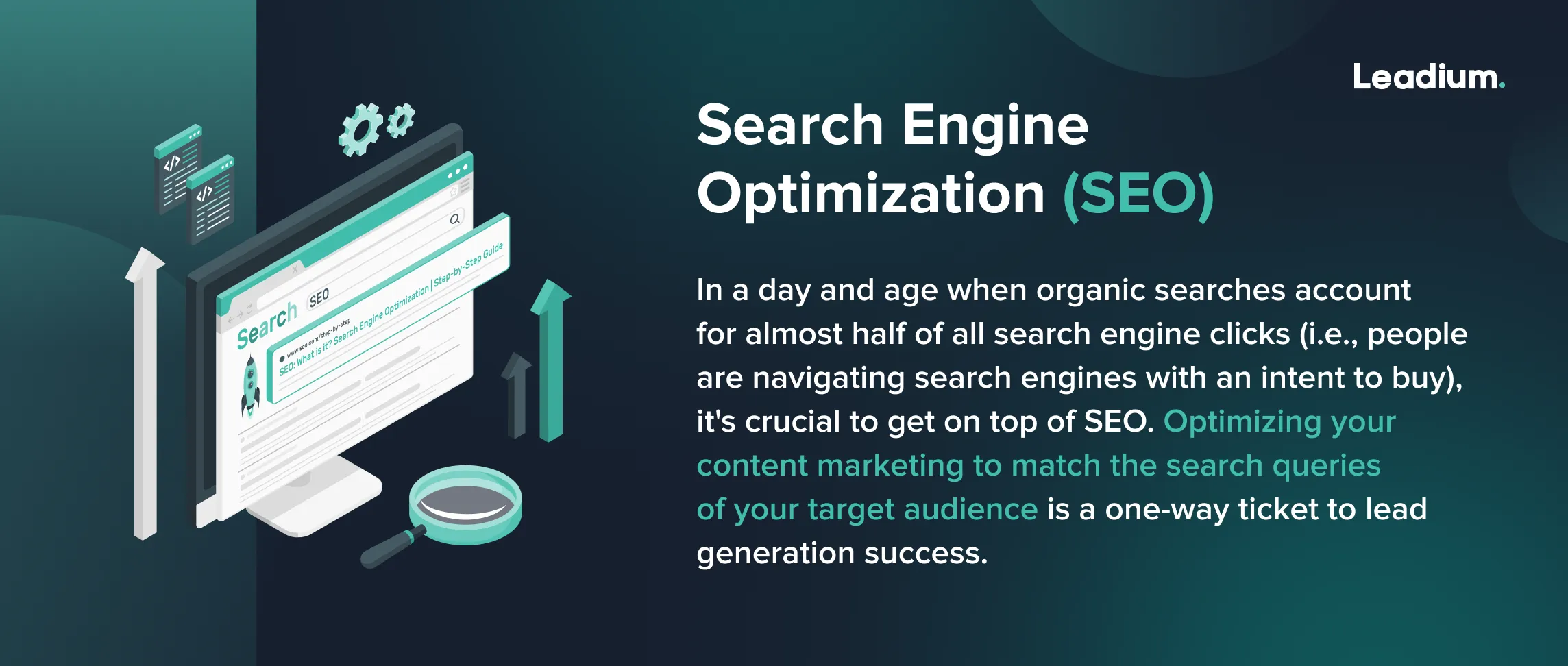 In a day and age when organic searches account for almost half of all search engine clicks (i.e., people are navigating search engines with an intent to buy), it's crucial to get on top of SEO. Optimizing your content marketing to match the search queries of your target audience is a one-way ticket to lead generation success.