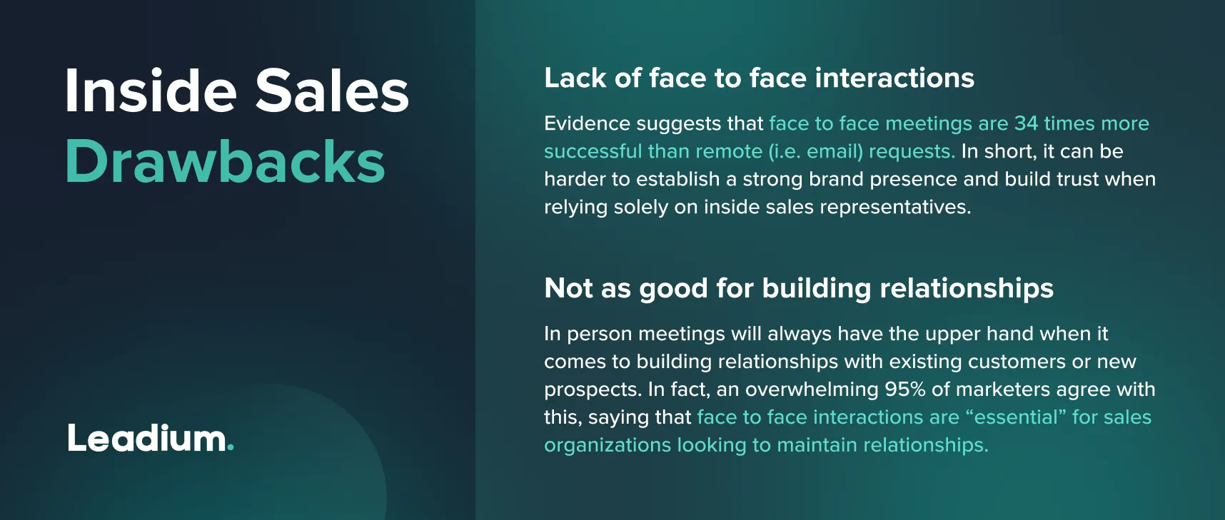 We're not here just to sing the praises of inside sales models; we're here to compare inside sales vs outside sales. To that end, it's only fair we take a look at some of the downsides of using inside sales as a primary sales strategy.