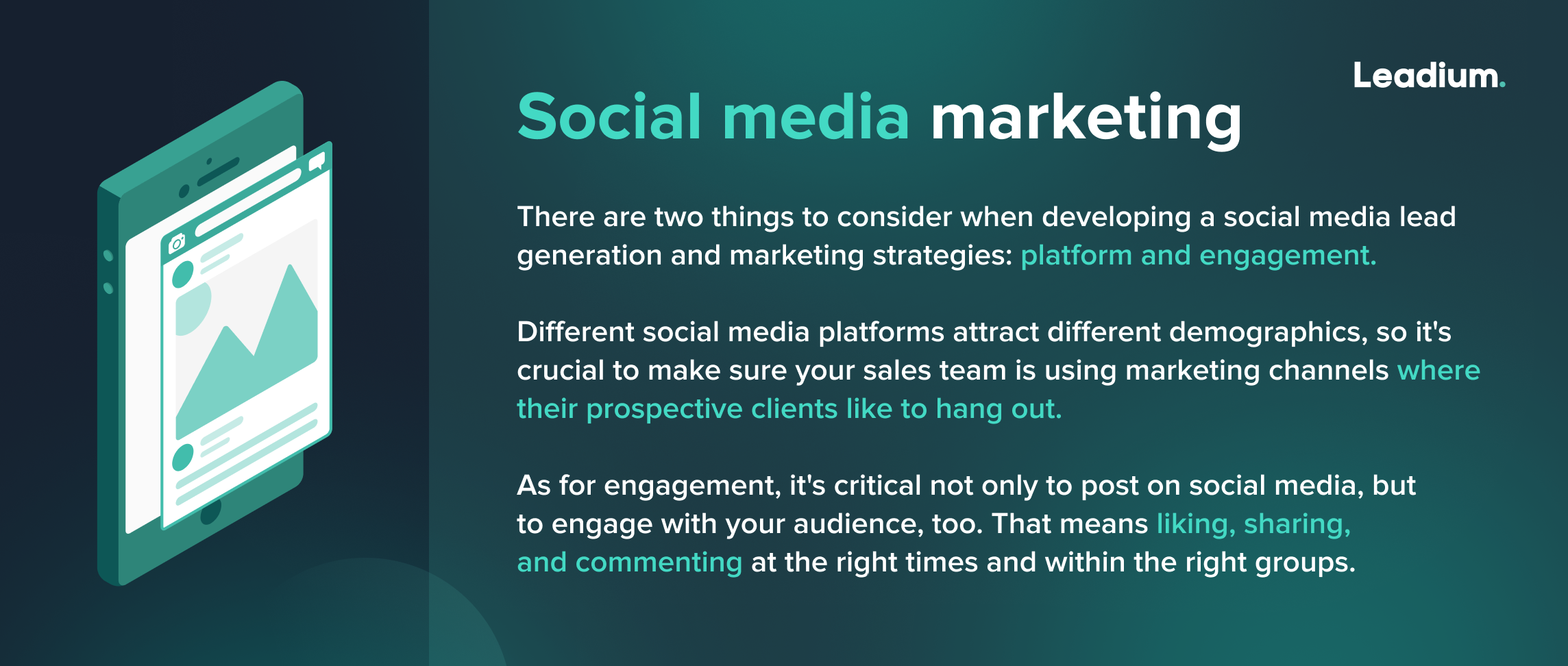 There are two things to consider when developing a social media lead generation and marketing strategies: platform and engagement.