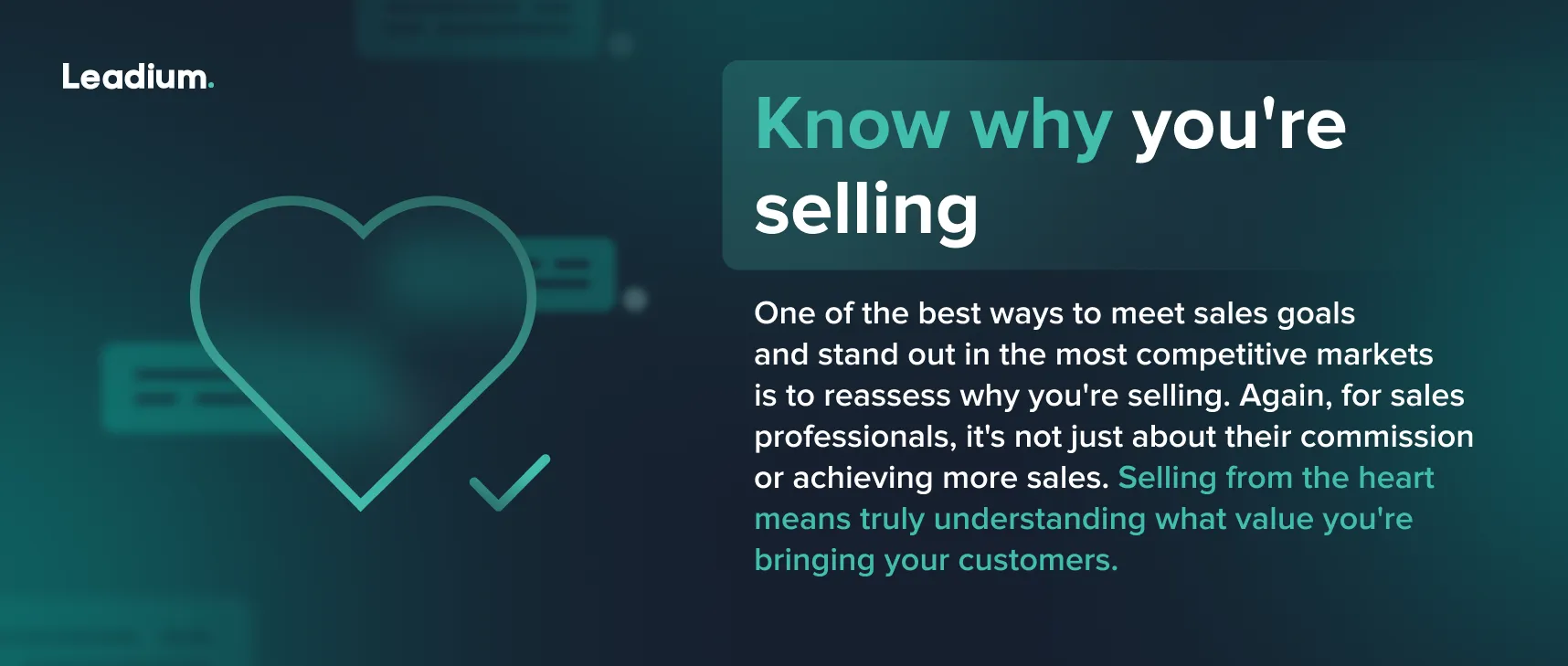 One of the best ways to meet sales goals and stand out in the most competitive markets is to reassess why you're selling. Again, for sales professionals, it's not just about their commission or achieving more sales. Selling from the heart means truly understanding what value you're bringing your customers.