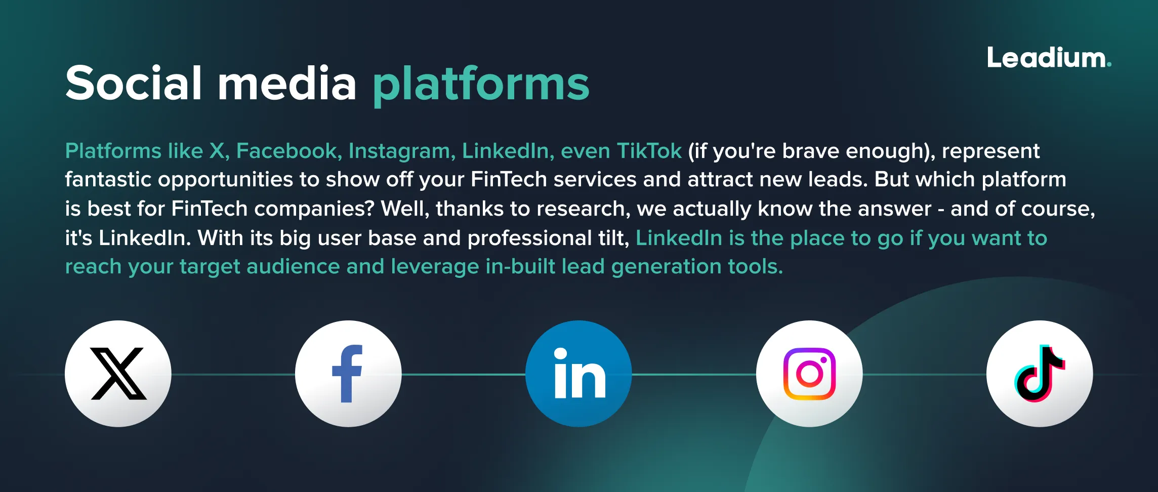 We could hardly talk about digital marketing tactics without mentioning social media, could we? Platforms like X, Facebook, Instagram, LinkedIn, even TikTok (if you're brave enough), represent fantastic opportunities to show off your FinTech services and attract new leads.