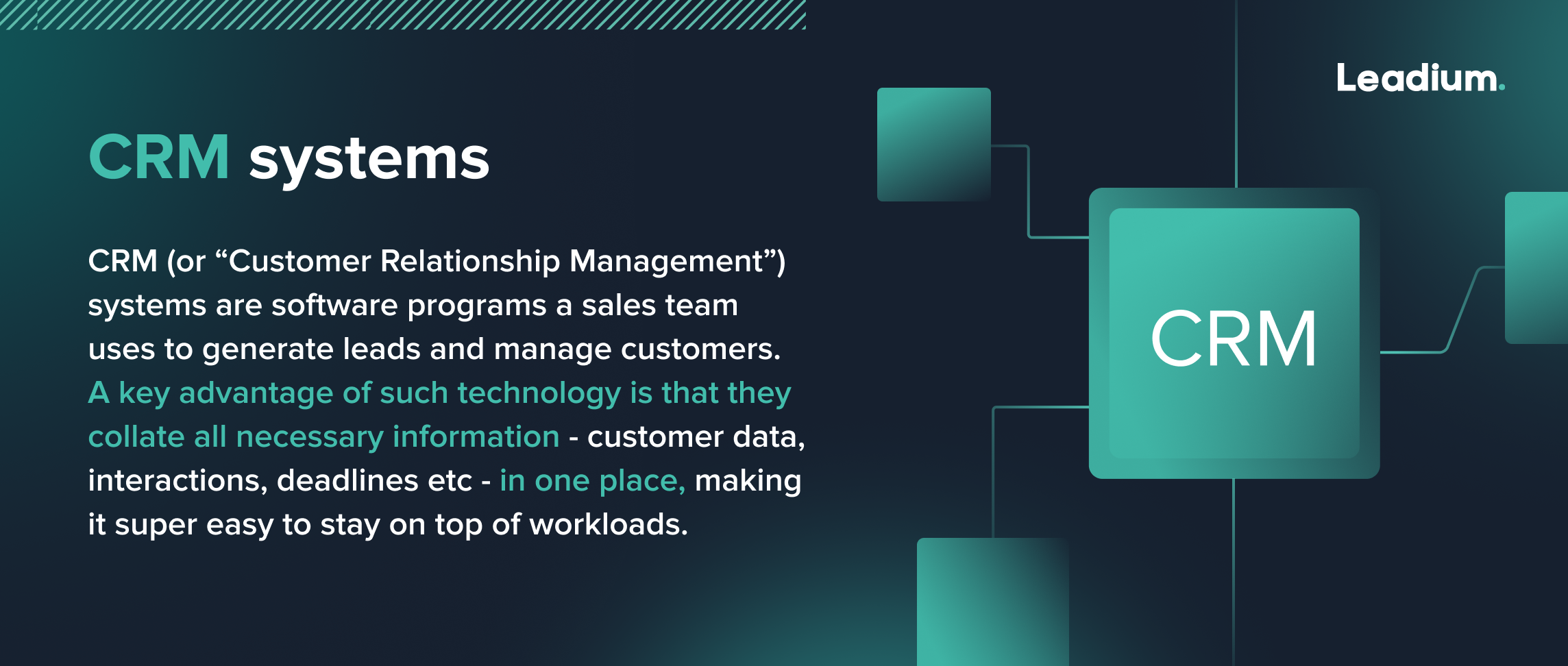 CRM (or 'Customer Relationship Management') systems are software programs a sales team uses to generate leads and manage customers. A key advantage of such technology is that they collate all necessary information - customer data, interactions, deadlines etc - in one place, making it super easy to stay on top of workloads.