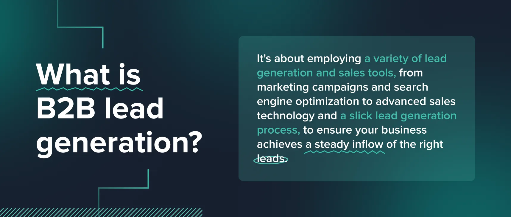 For those of you who are new to this, let's get a few things clear: B2B lead generation is not simply about spamming your entire target audience and hoping someone bites. It's about employing a variety of lead generation and sales tools, from marketing campaigns and search engine optimization to advanced sales technology and a slick lead generation process, to ensure your business achieves a steady inflow of the right leads (that means high-intent potential customers who fit your ICP and are looking to buy).