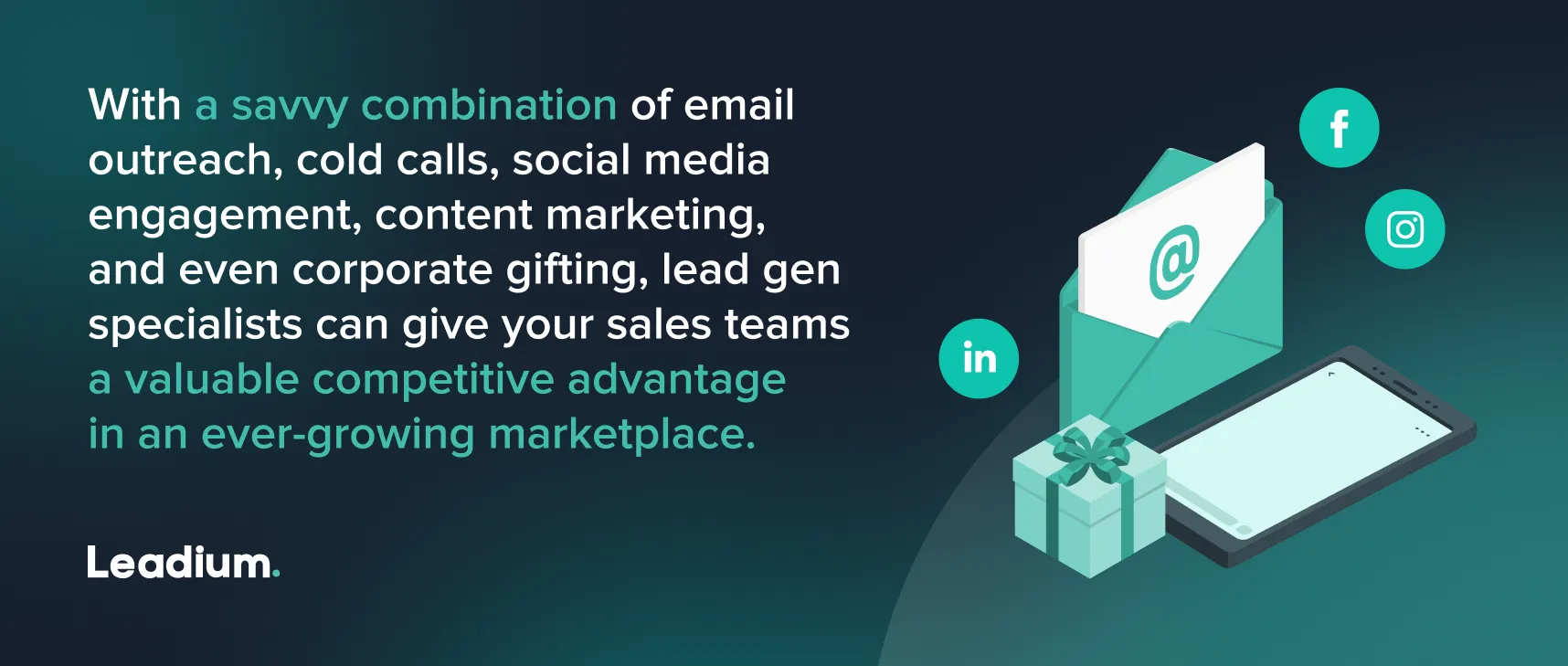 With a savvy combination of email outreach, cold calls, social media engagement, content marketing, and even corporate gifting, lead gen specialists can give your sales teams a valuable competitive advantage in an ever-growing marketplace.