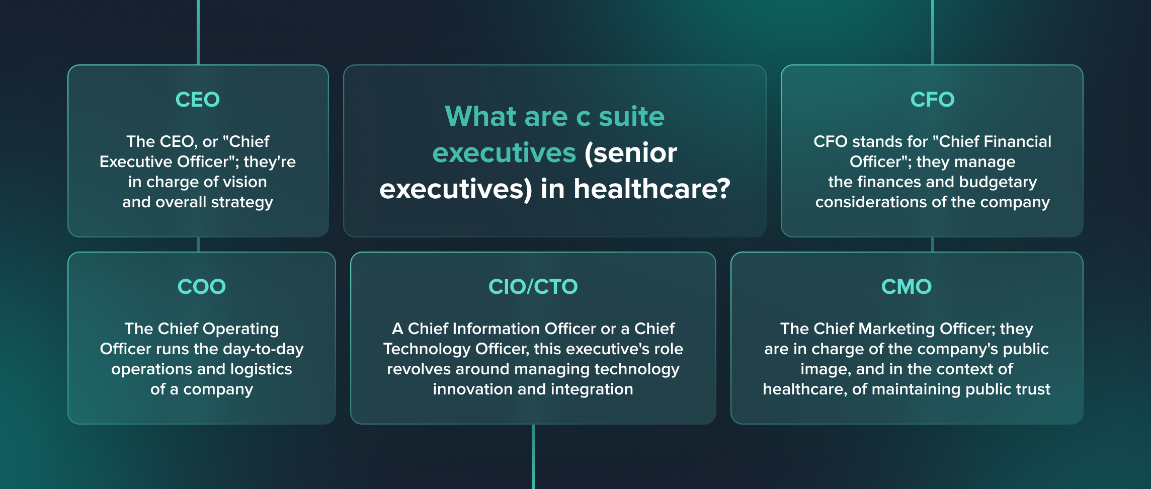 Healthcare is a large and complex industry. Defined by their high costs and regulatory constrictions, healthcare companies require a comprehensive management system made up of several key executives. When selling to the c suite, it's vital that you understand that person's individual role. That said, let's take a look at some of them: