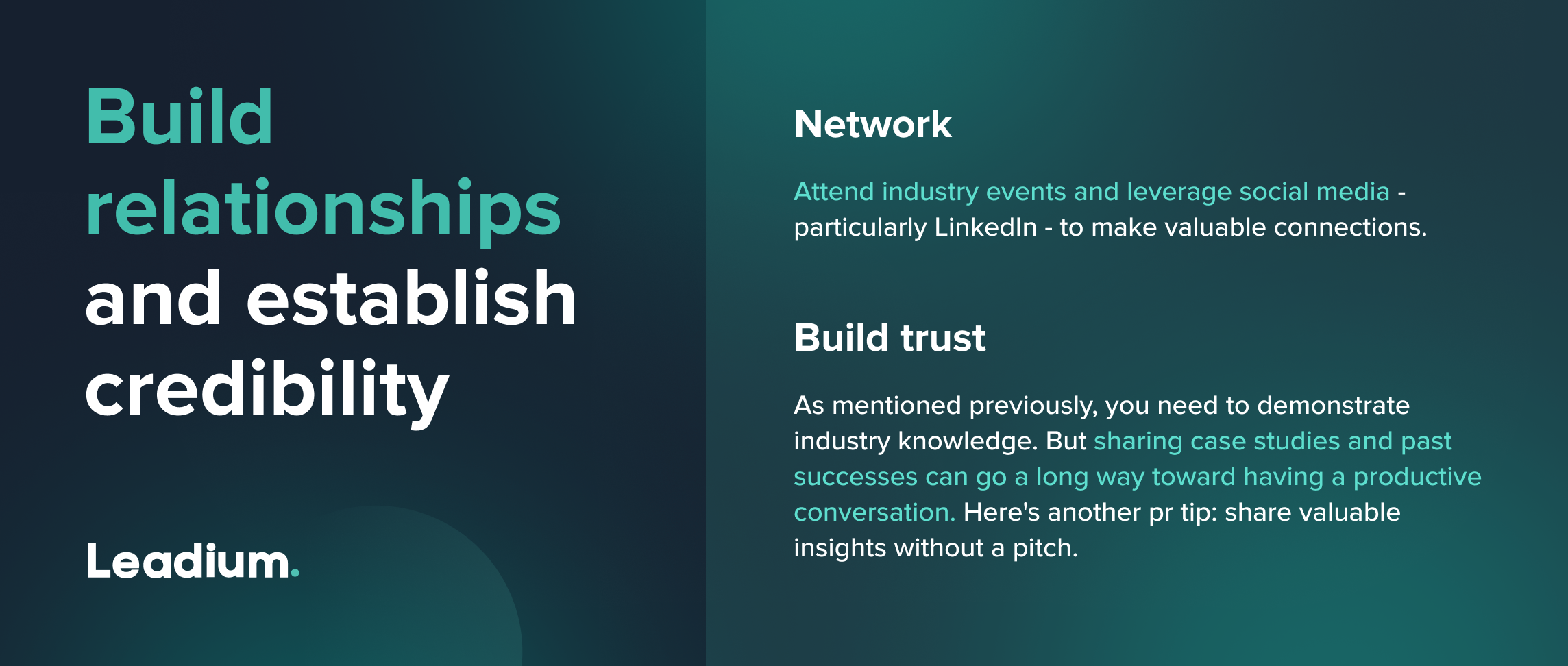 - As mentioned previously, you need to demonstrate industry knowledge. But sharing case studies and past successes can go a long way toward having a productive conversation. Here's another pr tip: share valuable insights without a pitch.