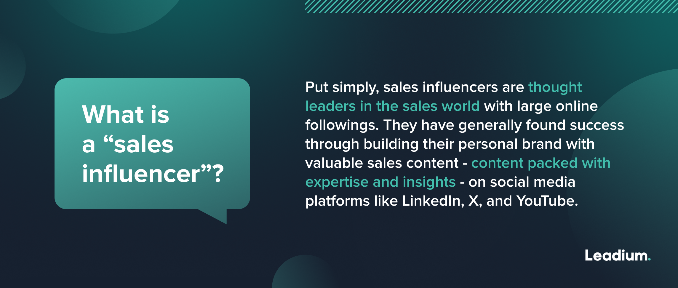 Put simply, sales influencers are thought leaders in the sales world with large online followings. They have generally found success through building their personal brand with valuable sales content - content packed with expertise and insights - on social media platforms like LinkedIn, X, and YouTube.