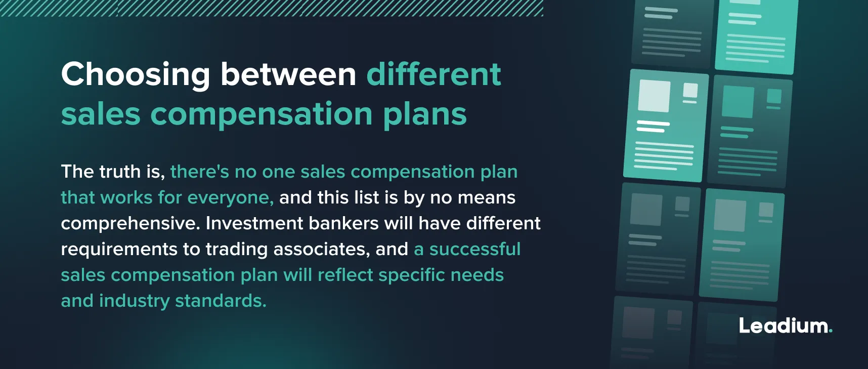 The truth is, there's no one sales compensation plan that works for everyone, and this list is by no means comprehensive. Investment bankers will have different requirements to trading associates, and successful sales compensation plan will reflect specific needs and industry standards.